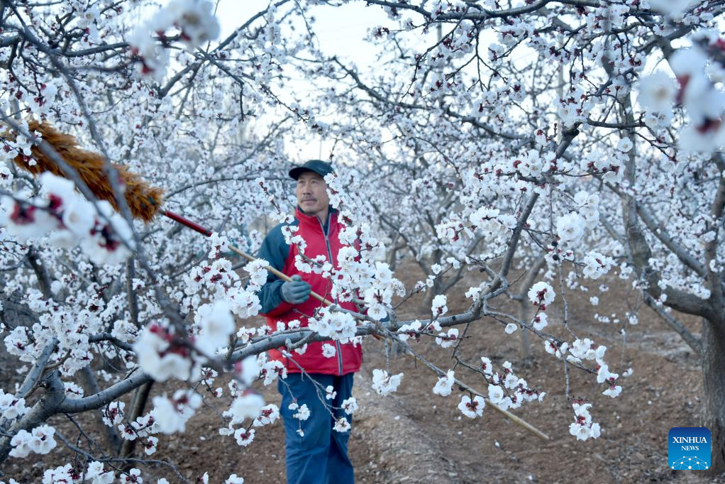 A farmer does artificial pollination for apricot flowers at Xigucheng Village, Zaozhuang City of east China's Shandong Province, March 19, 2025. With the approaching of spring equinox, or Chunfen in Chinese, the fourth solar term in the Chinese lunar calendar which will fall on March 20 this year, farmers across the country are busy working at fields. (Photo by Liu Mingxiang/Xinhua)