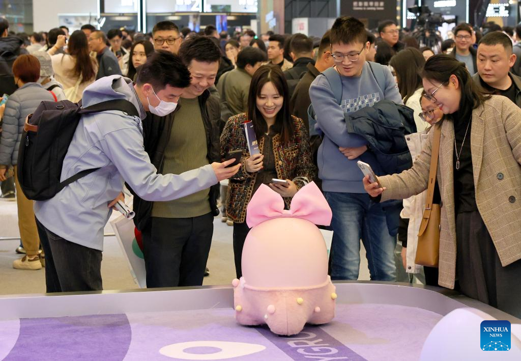 Visitors interact with an intelligent robot during the 2025 Appliance & Electronics World Expo (AWE2025) in east China's Shanghai, March 20, 2025. With the theme of "AI For All", the AWE2025 kicked off here on Thursday. More than a thousand enterprises from all over the world gathered at the expo to showcase their latest innovations. (Xinhua/Fang Zhe)
