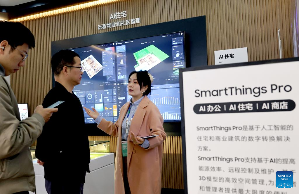 A staff member introduces AI residential solutions to visitors during the 2025 Appliance & Electronics World Expo (AWE2025) in east China's Shanghai, March 20, 2025. With the theme of "AI For All", the AWE2025 kicked off here on Thursday. More than a thousand enterprises from all over the world gathered at the expo to showcase their latest innovations. (Xinhua/Fang Zhe)