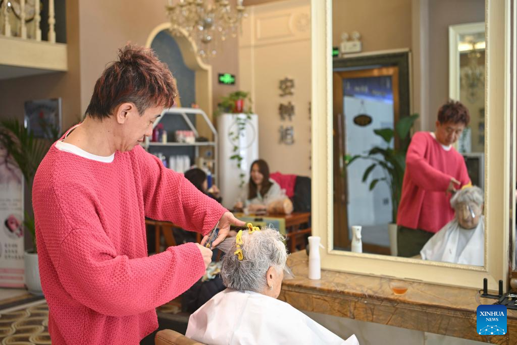 An Jong Euk gives a free haircut to a senior customer at a hair salon in Urumqi, northwest China's Xinjiang Uygur Autonomous Region, March 17, 2025. Hairdresser An Jong Euk is from Suwon, South Korea, and has been working and living in Xinjiang for more than 20 years. He first worked in a Korean hair salon in Urumqi, where he met his wife Shi Jifang, a colleague at that time. Later, the two of them seized the market opportunity and opened their own hair salon. The hairdresser's business expanded from a small hairdressing store to two large high-end salons in Urumqi's central business district and his hard work of bringing beauty to local residents has won him respect in his community. (Xinhua/Hu Huhu)