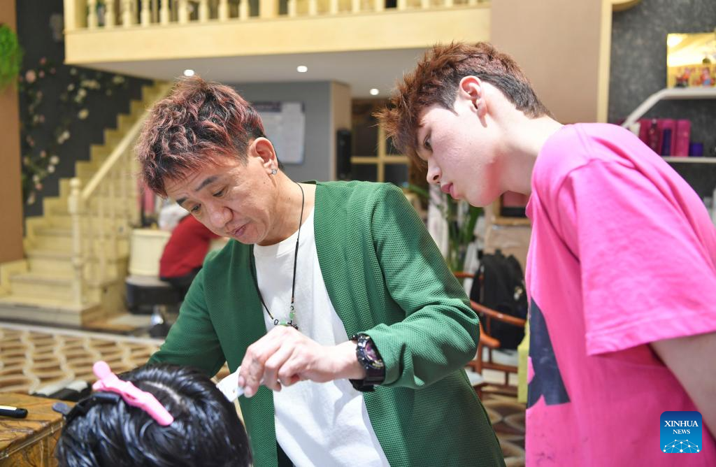An Jong Euk (L) gives a haircut to a customer while an intern observes on the side at a hair salon in Urumqi, northwest China's Xinjiang Uygur Autonomous Region, March 15, 2025. Hairdresser An Jong Euk is from Suwon, South Korea, and has been working and living in Xinjiang for more than 20 years. He first worked in a Korean hair salon in Urumqi, where he met his wife Shi Jifang, a colleague at that time. Later, the two of them seized the market opportunity and opened their own hair salon. The hairdresser's business expanded from a small hairdressing store to two large high-end salons in Urumqi's central business district and his hard work of bringing beauty to local residents has won him respect in his community. (Xinhua/Hu Huhu)