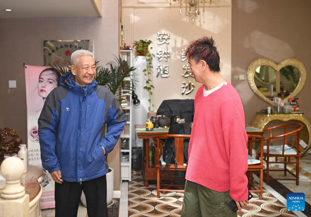 An Jong Euk (R) invites his neighbor to visit his home in Urumqi, northwest China's Xinjiang Uygur Autonomous Region, March 18, 2025. Hairdresser An Jong Euk is from Suwon, South Korea, and has been working and living in Xinjiang for more than 20 years. He first worked in a Korean hair salon in Urumqi, where he met his wife Shi Jifang, a colleague at that time. Later, the two of them seized the market opportunity and opened their own hair salon. The hairdresser's business expanded from a small hairdressing store to two large high-end salons in Urumqi's central business district and his hard work of bringing beauty to local residents has won him respect in his community. (Xinhua/Hu Huhu)