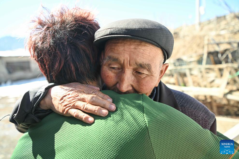 An Jong Euk (L) embraces his neighbor in Urumqi, northwest China's Xinjiang Uygur Autonomous Region, March 18, 2025. Hairdresser An Jong Euk is from Suwon, South Korea, and has been working and living in Xinjiang for more than 20 years. He first worked in a Korean hair salon in Urumqi, where he met his wife Shi Jifang, a colleague at that time. Later, the two of them seized the market opportunity and opened their own hair salon. The hairdresser's business expanded from a small hairdressing store to two large high-end salons in Urumqi's central business district and his hard work of bringing beauty to local residents has won him respect in his community. (Xinhua/Hu Huhu)