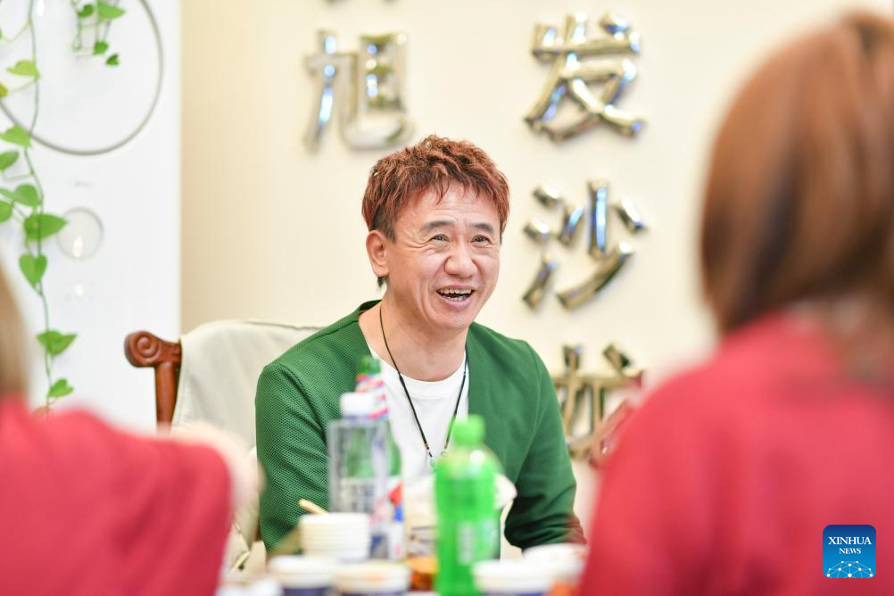An Jong Euk chats with staff members at a hair salon in Urumqi, northwest China's Xinjiang Uygur Autonomous Region, March 15, 2025. Hairdresser An Jong Euk is from Suwon, South Korea, and has been working and living in Xinjiang for more than 20 years. He first worked in a Korean hair salon in Urumqi, where he met his wife Shi Jifang, a colleague at that time. Later, the two of them seized the market opportunity and opened their own hair salon. The hairdresser's business expanded from a small hairdressing store to two large high-end salons in Urumqi's central business district and his hard work of bringing beauty to local residents has won him respect in his community. (Xinhua/Hu Huhu)