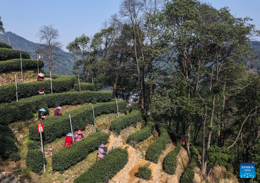 Tea farmers pick this year's first batch of West Lake Longjing tea in Wengjiashan Mountains, the first-class protected area of West Lake Longjing tea base, in Hangzhou, east China's Zhejiang Province, March 20, 2025. (Xinhua/Xu Yu)