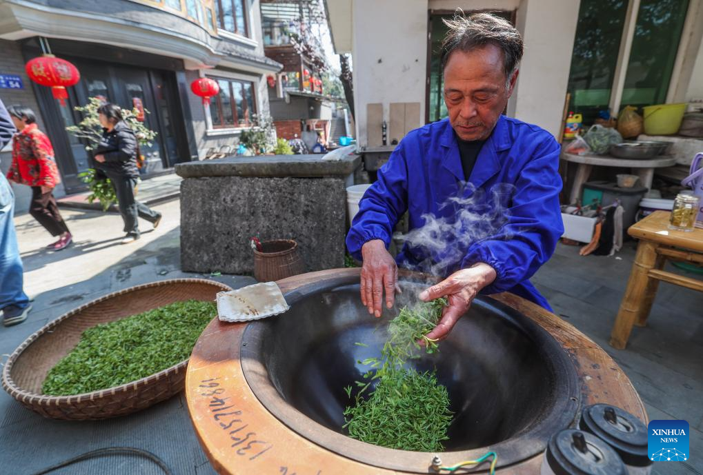 Tea farmer Weng Yongpei fries the newly picked West Lake Longjing tea in Wengjiashan village, the first-class protected area of West Lake Longjing tea base, in Hangzhou, east China's Zhejiang Province, March 20, 2025. (Xinhua/Xu Yu)