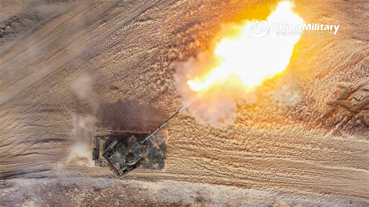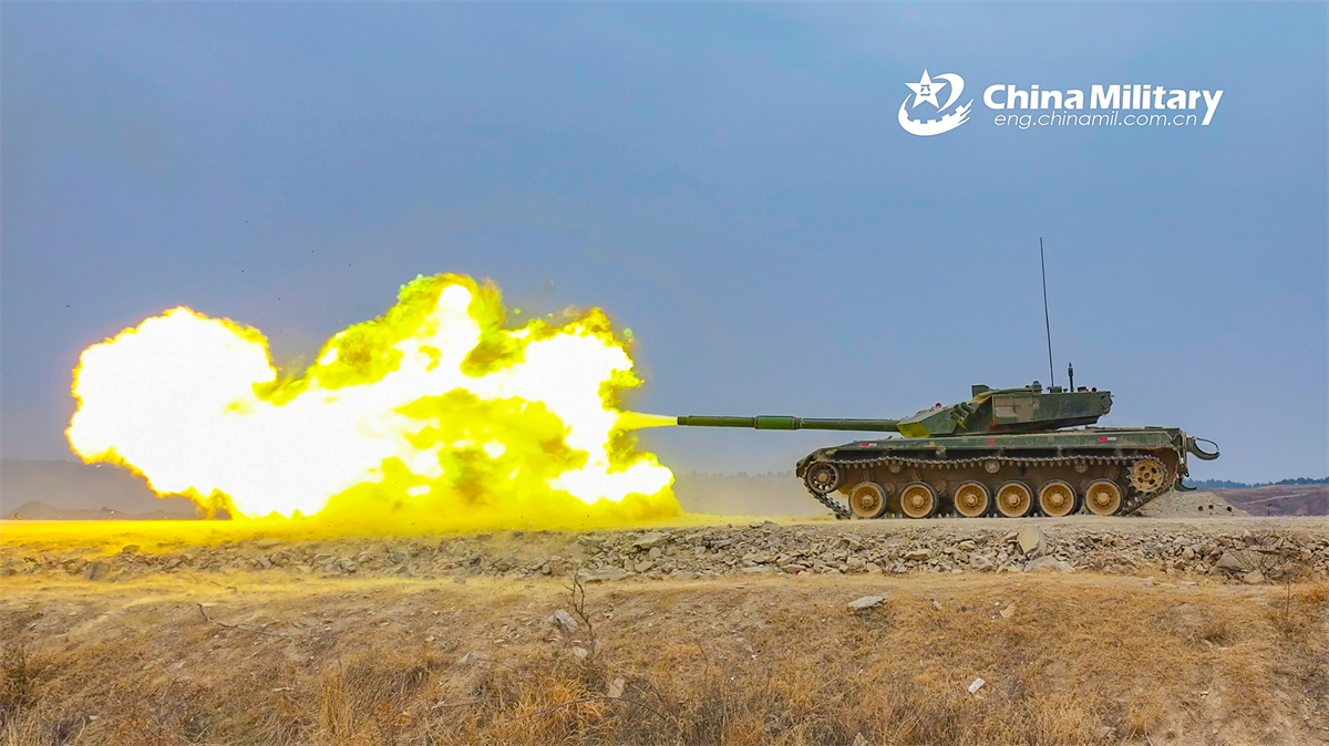 A main battle tank (MBT) attached to a combined-arms brigade of the Chinese PLA Army fires at the mock targets during a live-fire shooting training exercise in early March 2025. (eng.chinamil.com.cn/Huang Zhenyu)