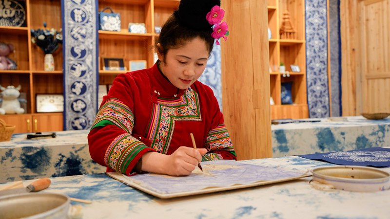 An artisan showcases batik-making skills of the Dong ethnic group in Zhaoxing Dong village, Liping county, Qiandongnan Miao and Dong Autonomous Prefecture, southwest China's Guizhou Province. (Photo/Yao Jingquan)