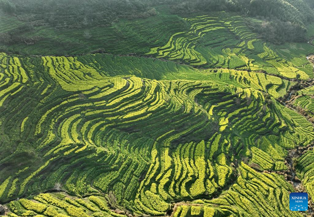 An aerial drone photo taken on March 19, 2025 shows blooming cole flowers at Jiangling scenic spot in Wuyuan County, east China's Jiangxi Province. (Xinhua/Wan Xiang)