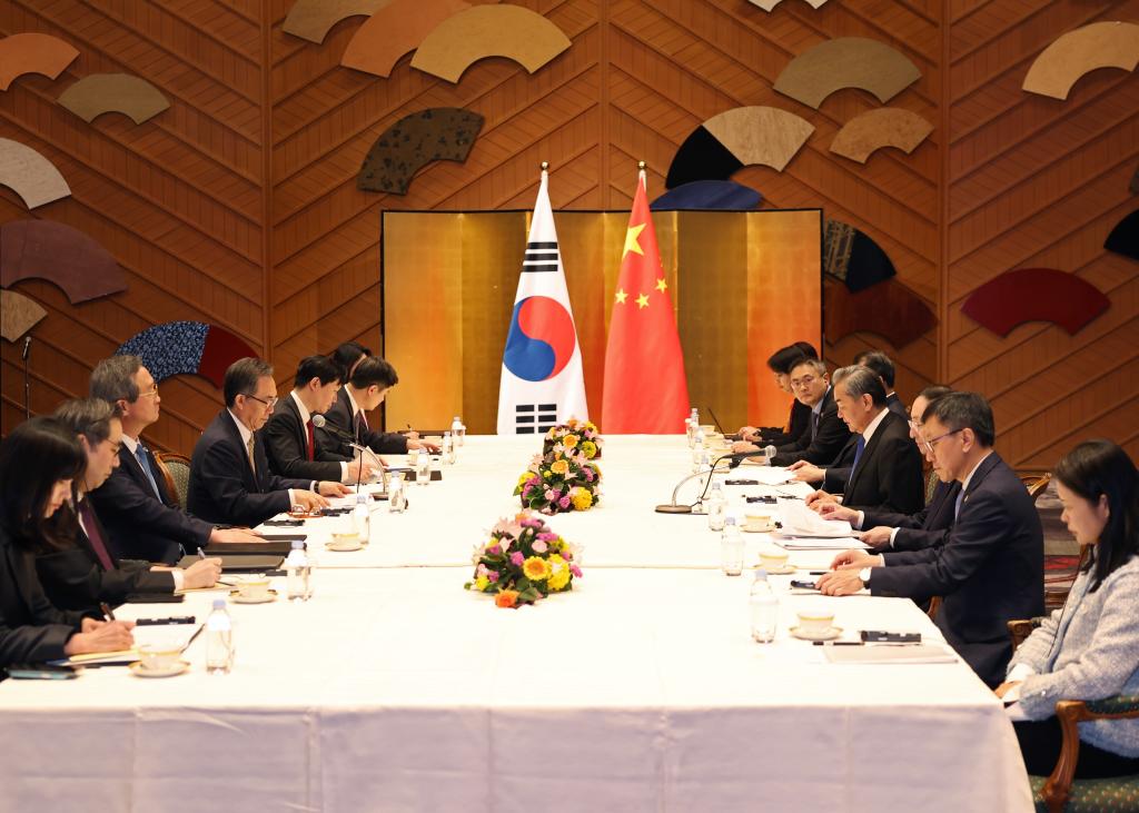 Chinese Foreign Minister Wang Yi, also a member of the Political Bureau of the Communist Party of China Central Committee, meets with Cho Tae-yul, Minister of Foreign Affairs of the Republic of Korea (ROK), ahead of the 11th China-Japan-ROK Trilateral Foreign Ministers' Meeting in Tokyo, Japan, on March 21, 2025. (Xinhua/Jia Haocheng)