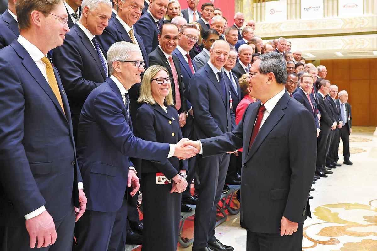 Premier Li Qiang shakes hands with Apple CEO Tim Cook on Sunday in Beijing before the opening ceremony of the China Development Forum 2025. (Wang Zhuangfei/China Daily)