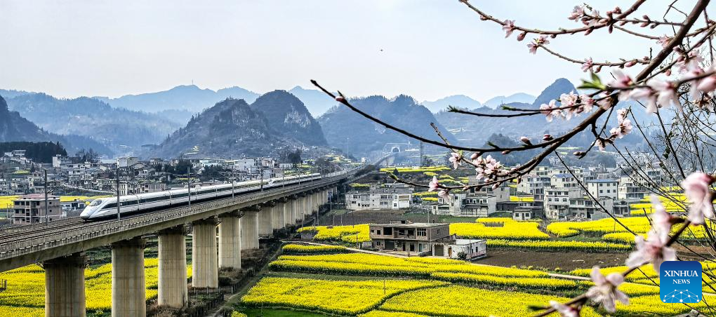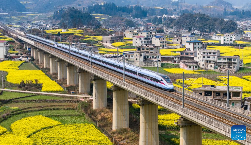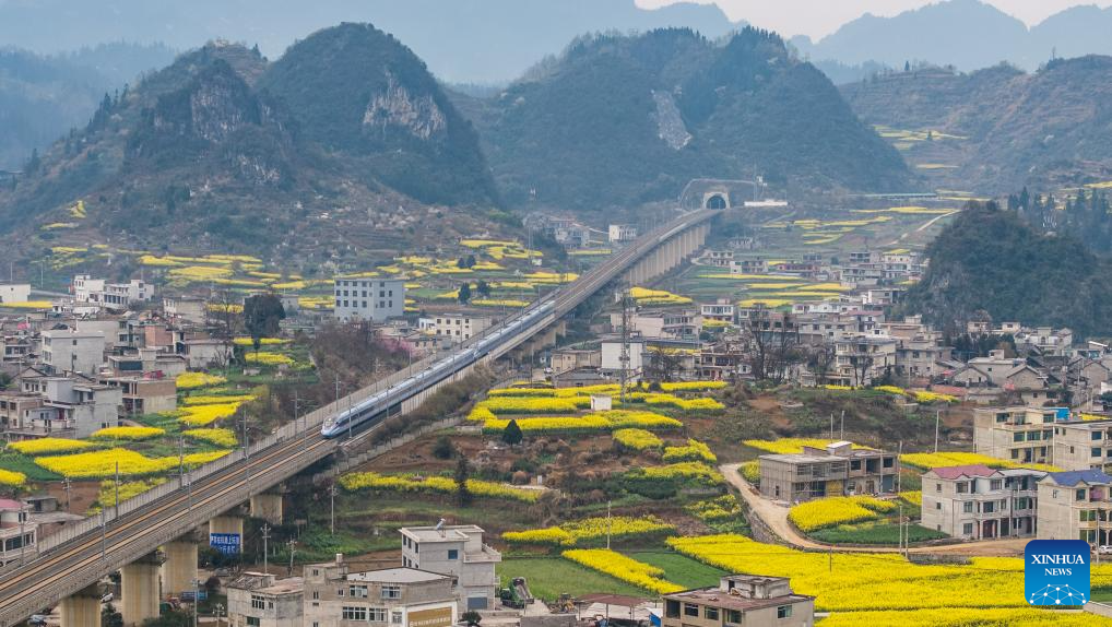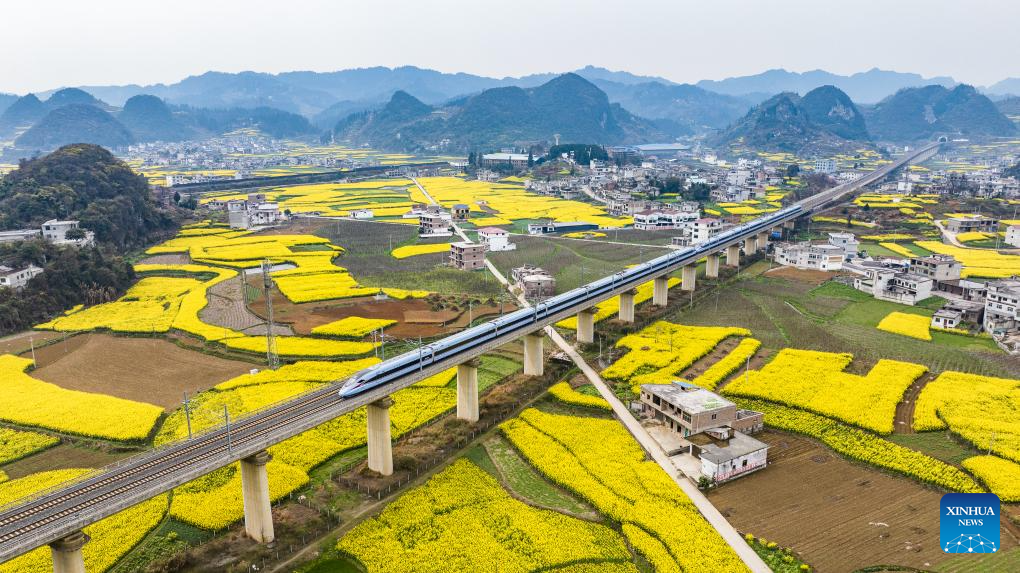 An aerial drone photo shows a high-speed train passing by flowering canola fields in Huachu Town, Puding County, Anshun City, southwest China's Guizhou Province, March 22, 2025. (Xinhua/Tao Liang)