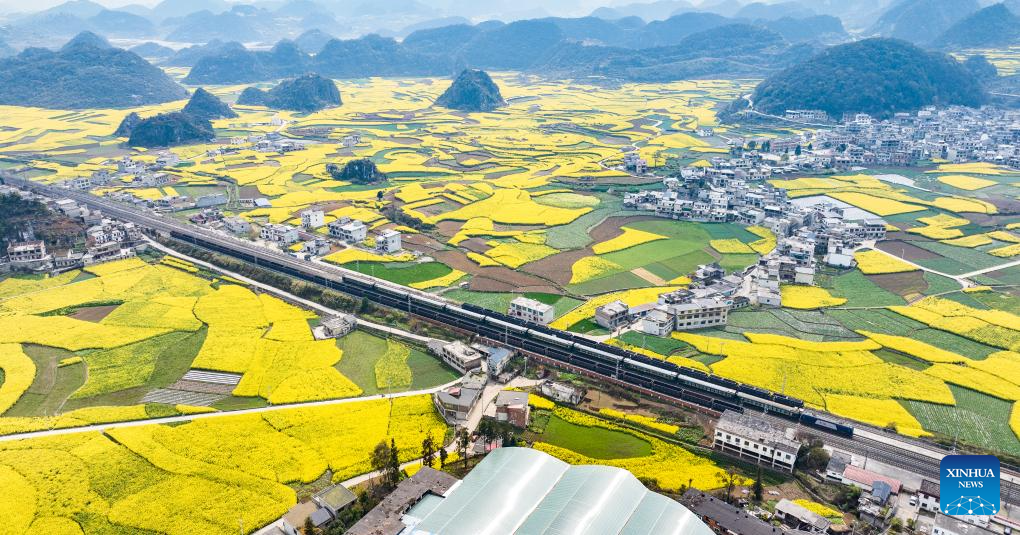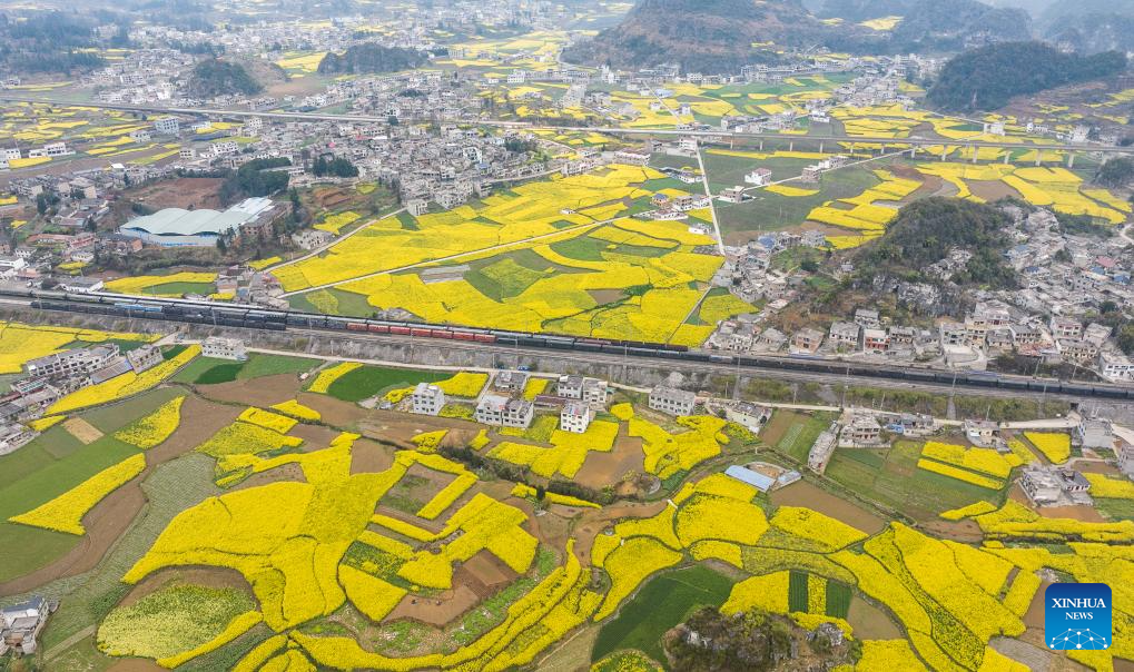 An aerial drone photo shows a train passing by flowering canola fields in Puding County, Anshun City, southwest China's Guizhou Province, March 22, 2025. (Xinhua/Tao Liang)