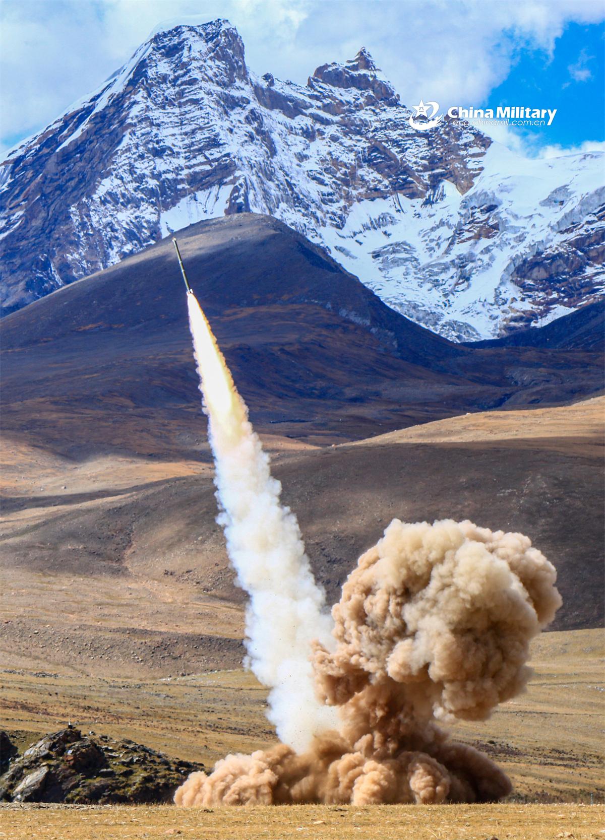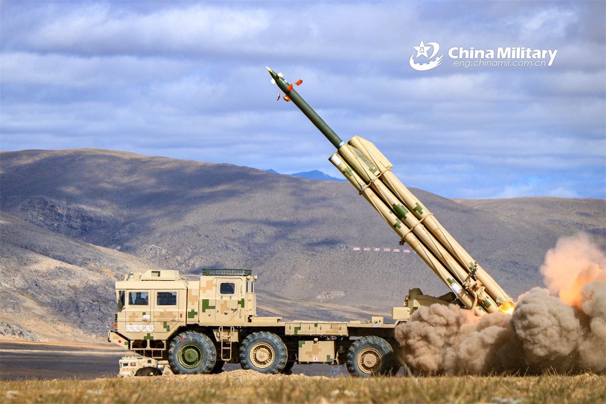 A long-range multiple launch rocket system (MLRS) attached to a long-range strike detachment with a brigade under the Chinese PLA 77th Group Army fires at the simulated target during a live-fire training exercise. (eng.chinamil.com.cn/Cai Congrun)