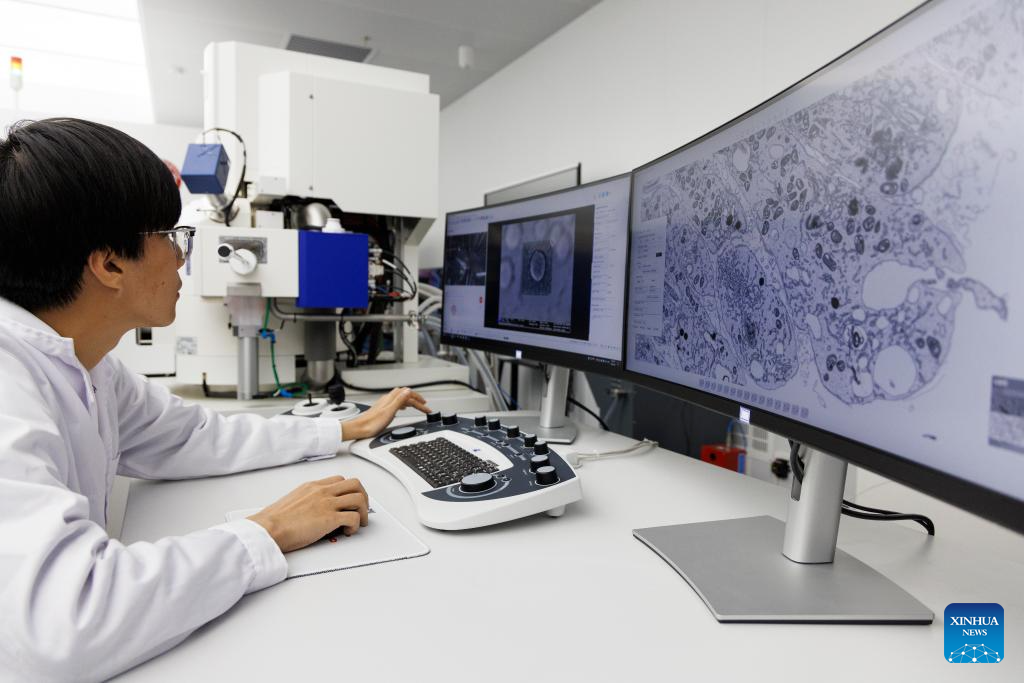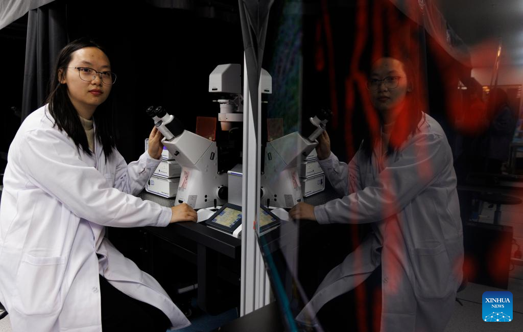 An engineer from the Institute of Biophysics under the Chinese Academy of Sciences uses a microscope of a multimodal in vivo cell imaging device in Beijing, capital of China, March 20, 2025. (Xinhua/Jin Liwang)