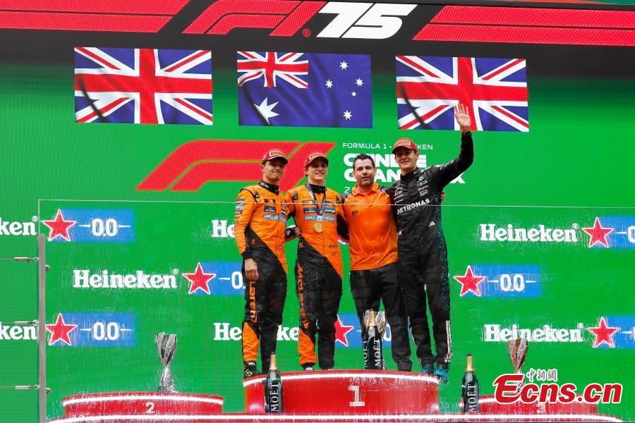 McLaren's driver Oscar Piastri (2nd L) of Australia celebrates during the awarding ceremony of the Formula 1 Chinese Grand Prix race at the Shanghai International Circuit, March 23, 2025. (China News Service/Zhang Hengwei)