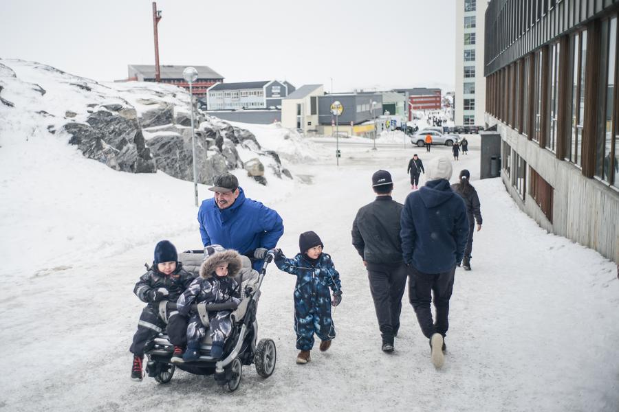 A man takes three children walking in the snow in Nuuk, Greenland, an autonomous territory of Denmark, March 19, 2025. (Xinhua/Peng Ziyang)