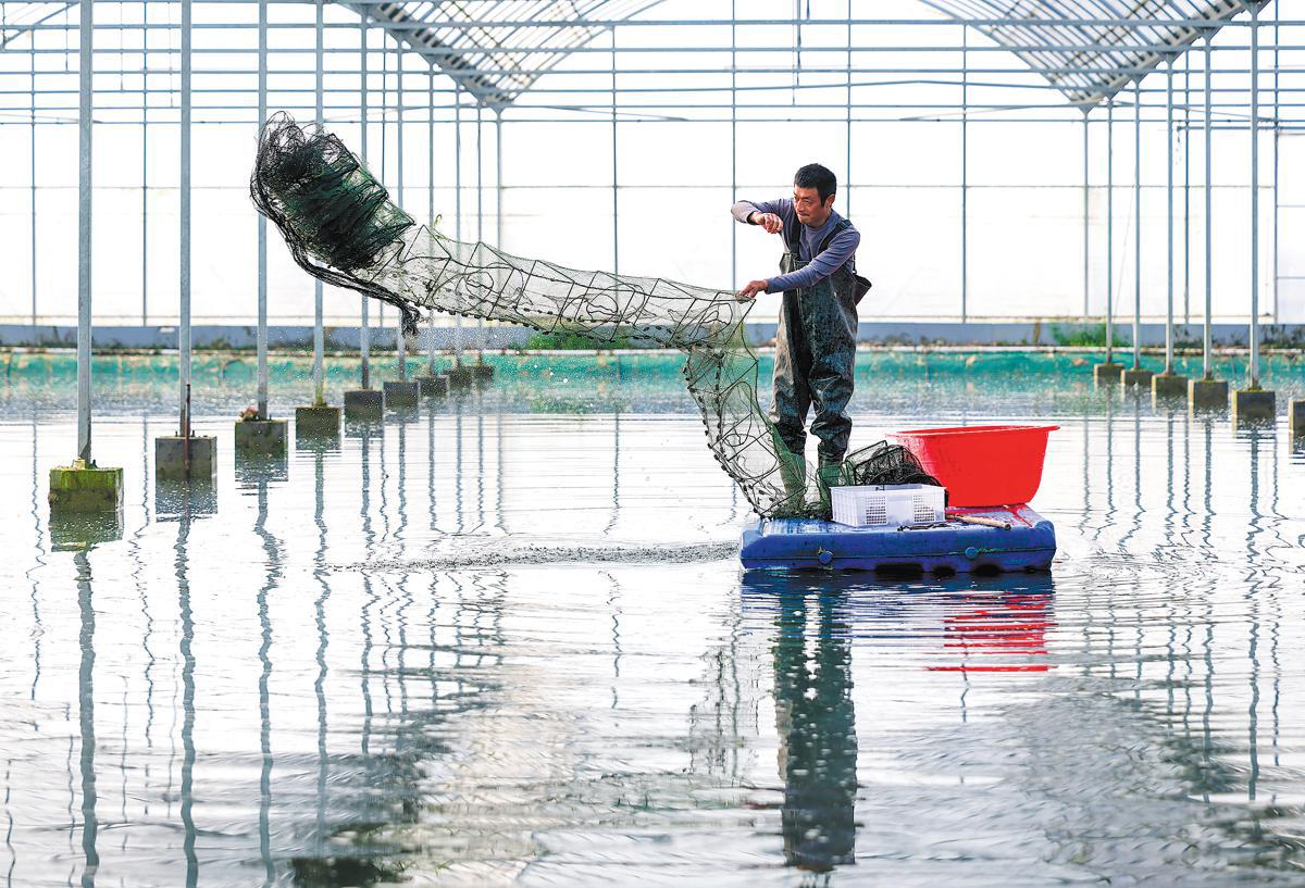 A farmer works at a modern crayfish farm in Xuyi on March 8. (Wang Chun/Xinhua)