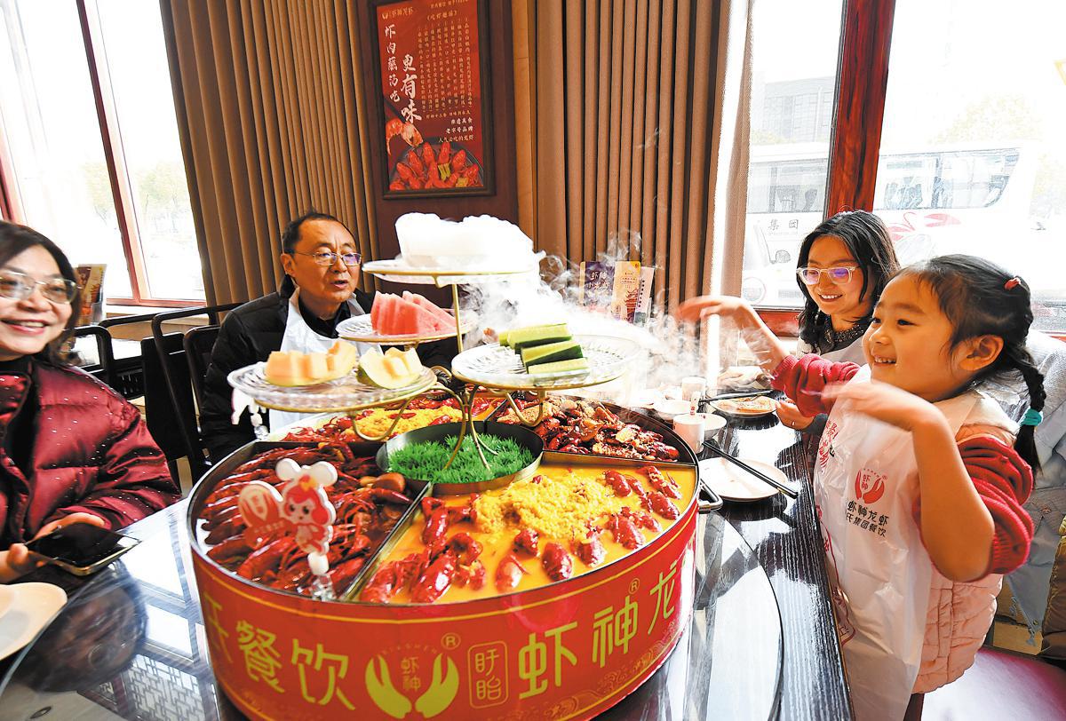 People enjoy crayfish dishes at a restaurant in Xuyi on March 8. (Yang Suping/Xinhua)