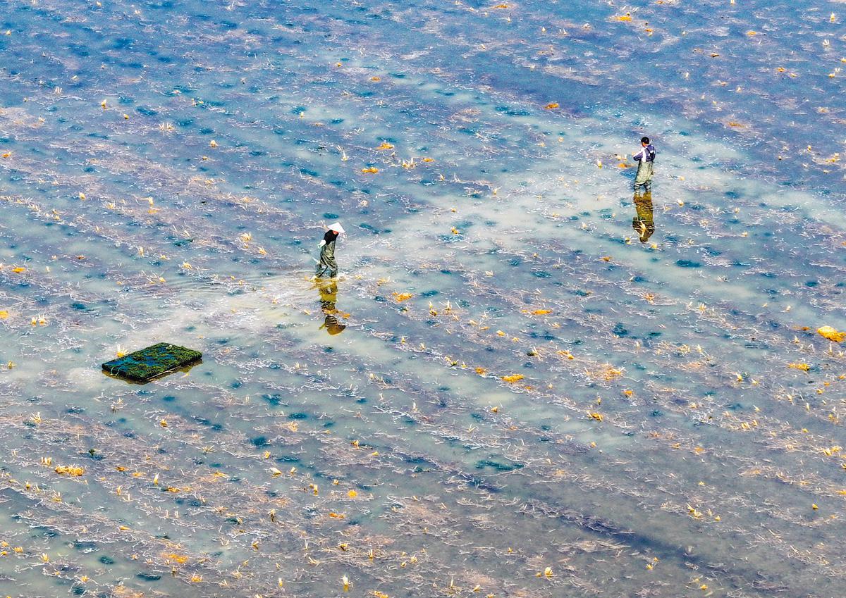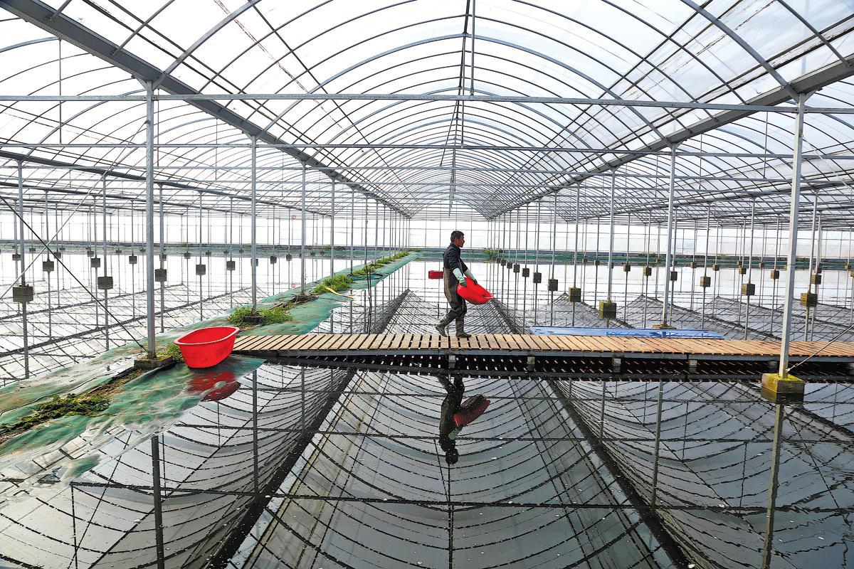 Farmers grow aquatic plants at a modern crayfish farm in Xuyi on March 8. (Gu Jihong/Xinhua)