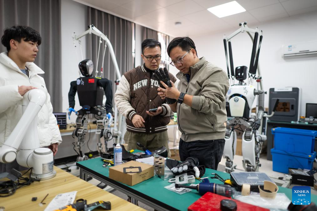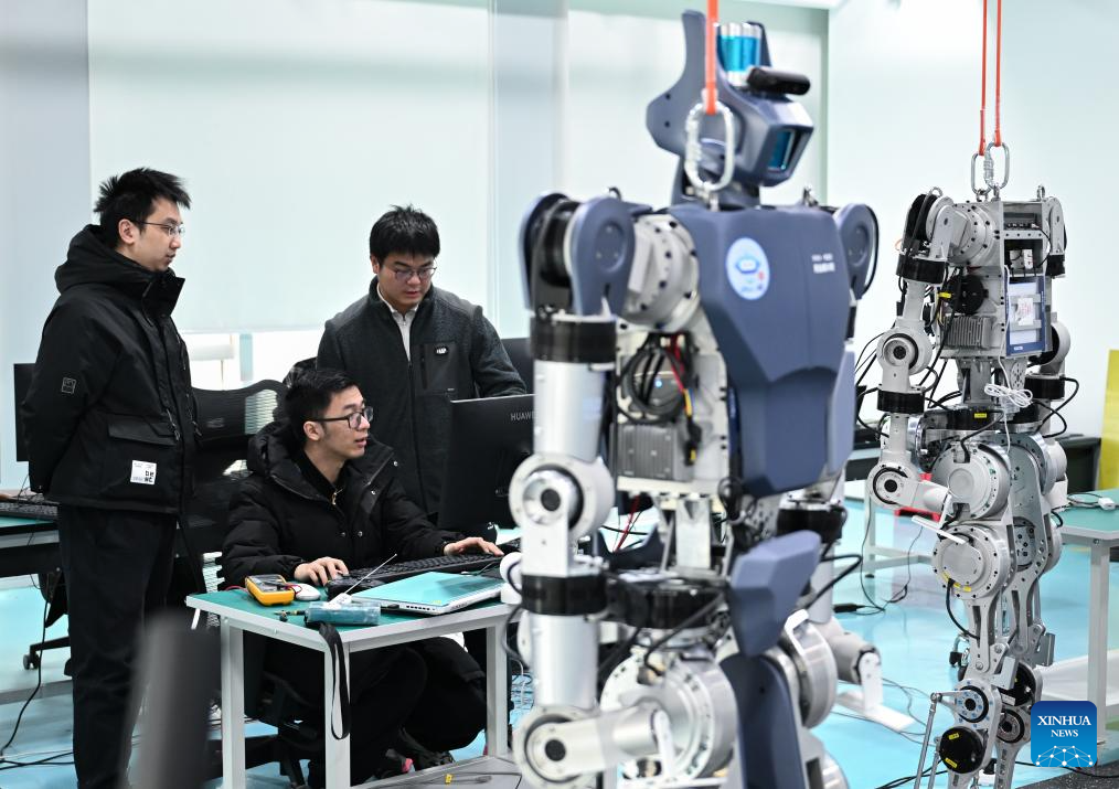 Members of the R&D team of Wuhan Glory Road Intelligent Technology Co., Ltd. debug a humanoid robot at the company in Wuhan, central China's Hubei Province, Feb. 24, 2025. In recent years, Hubei Province has strengthened the introduction and training of scientific and technological innovation subjects and promoted the development of humanoid robot industry.
