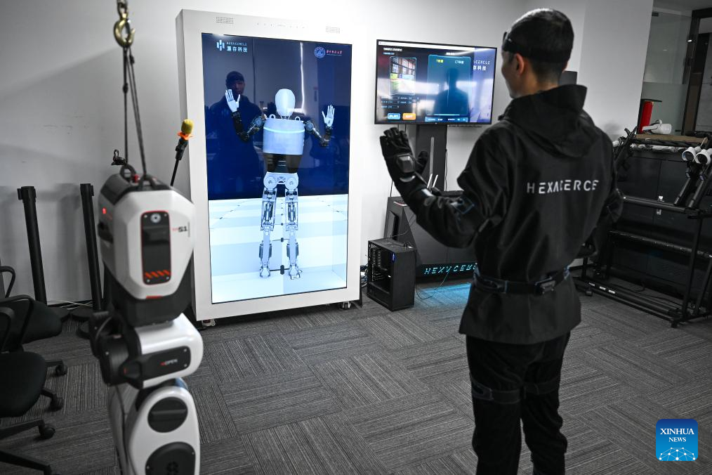 A R&D team member debugs the motor nerve center system of a humanoid robot at HexaCercle, a science and technology company in Wuhan, central China's Hubei Province, March 24, 2025. In recent years, Hubei Province has strengthened the introduction and training of scientific and technological innovation subjects and promoted the development of humanoid robot industry.