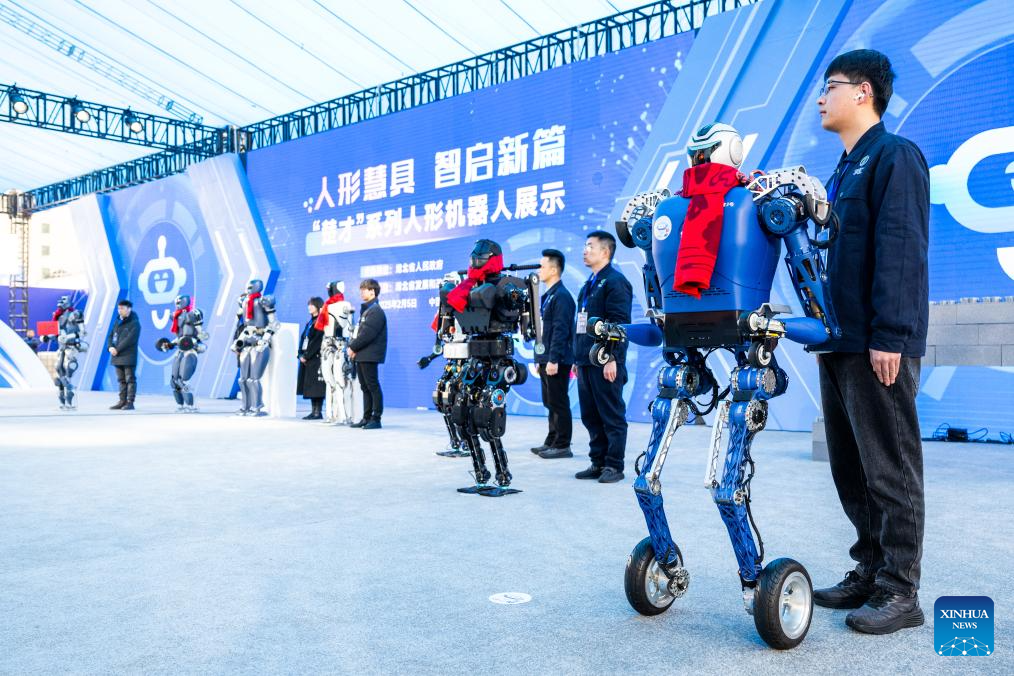 Humanoid robots show up at a conference on promoting the rise of China's central region in Wuhan, central China's Hubei Province, Feb. 5, 2025. In recent years, Hubei Province has strengthened the introduction and training of scientific and technological innovation subjects and promoted the development of humanoid robot industry.