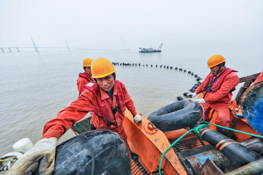 File photo shows workers towing a section of the submarine cable to the terminal station at Dapengshan Island in Zhoushan, east China's Zhejiang Province. (Xinhua/Xu Yu)
