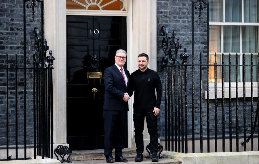 British Prime Minister Keir Starmer (L) shakes hands with visiting Ukrainian President Volodymyr Zelensky in front of 10 Downing Street in London, Britain, March 1, 2025. (Xinhua/Li Ying)