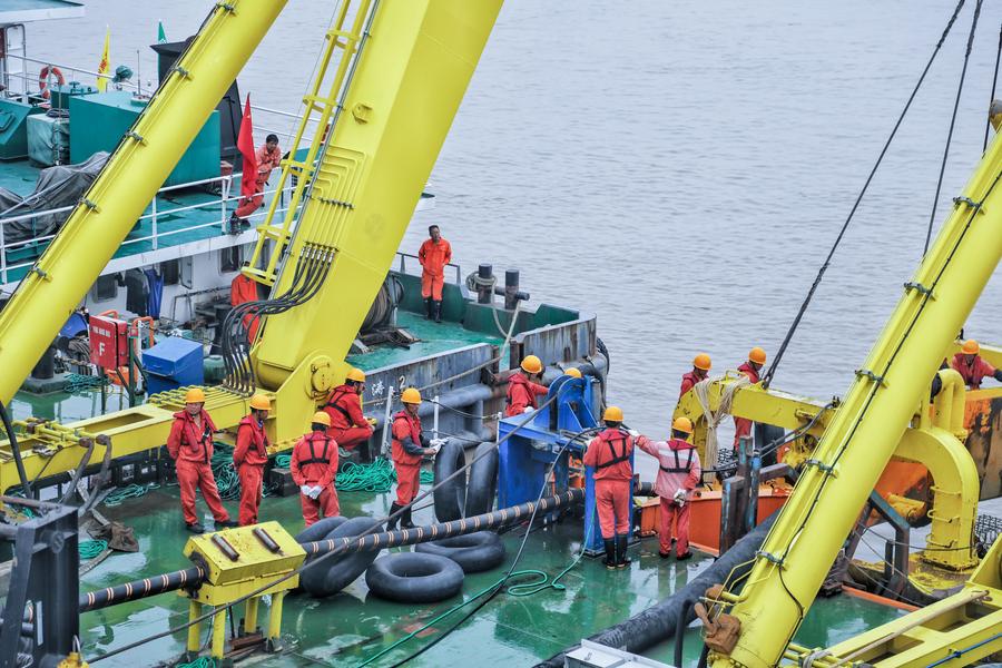 File photo shows workers laying submarine cable on the construction boat in Zhoushan, east China's Zhejiang Province. (Xinhua/Xu Yu)
