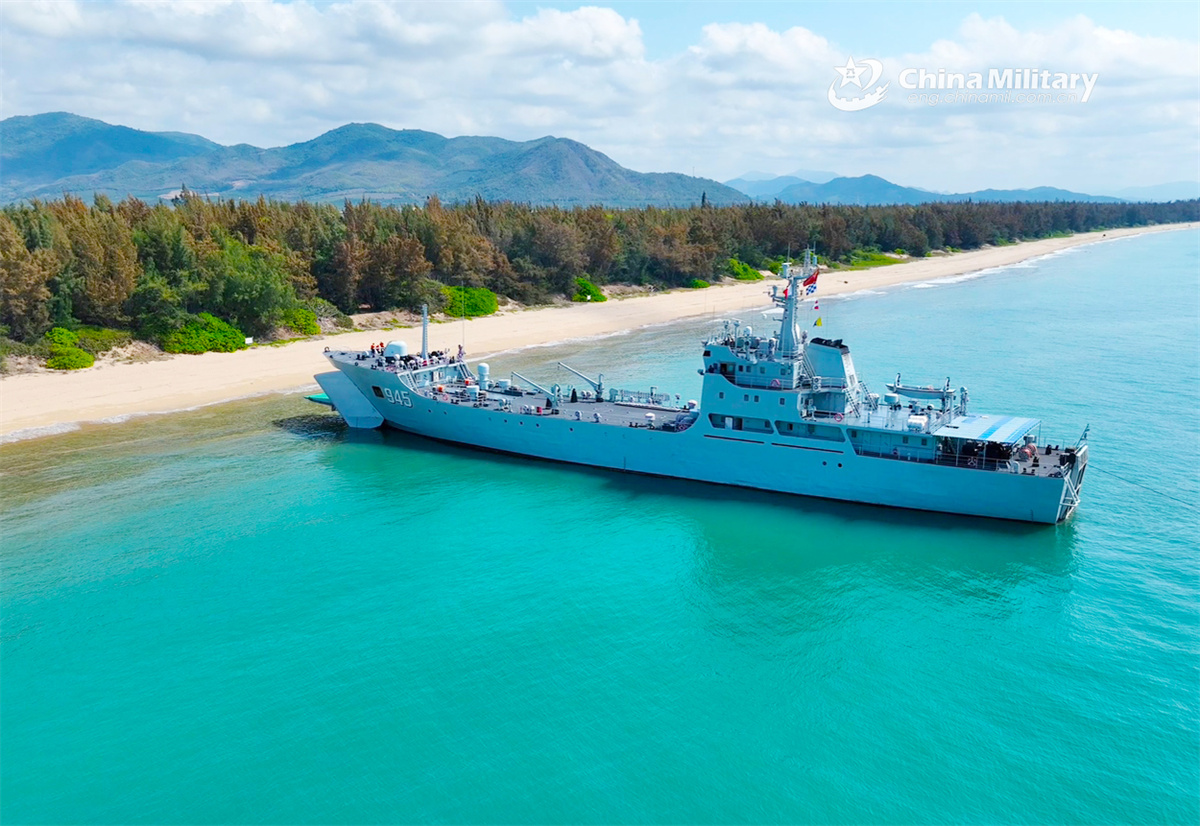 The medium landing ship Huashan (Hull 945) attached to a naval service ship group under the Chinese PLA Southern Theater Command dashes towards the beachhead during a maritime combat training exercise in the South China Sea in early March 2025. (eng.chinamil.com.cn/Photo by Wu Huanqing)