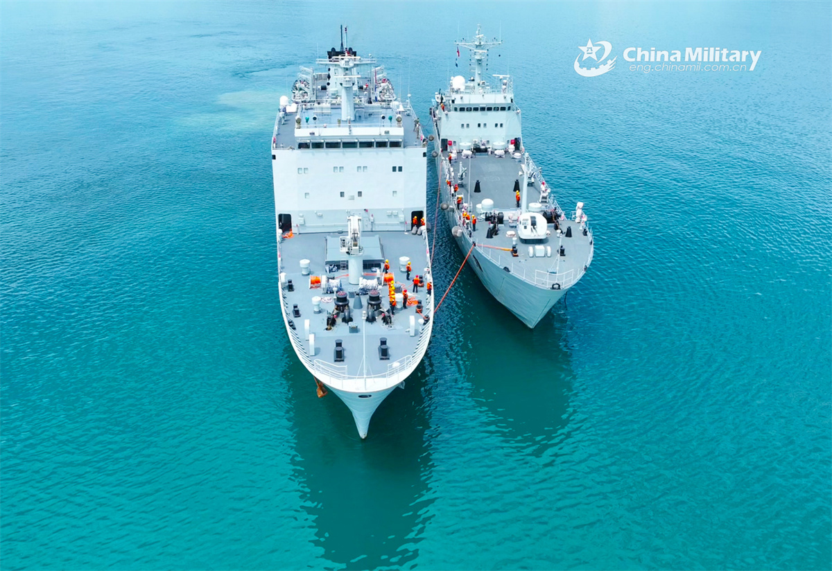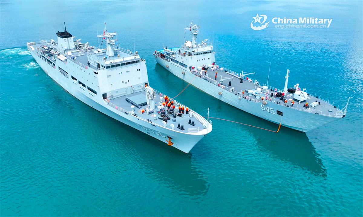 The medium landing ship Huashan (Hull 945) and a transport ship attached to a naval service ship group under the Chinese PLA Southern Theater Command conduct alongside replenishment-at-sea during a maritime combat training exercise in the South China Sea in early March 2025. (eng.chinamil.com.cn/Photo by Wu Huanqing)