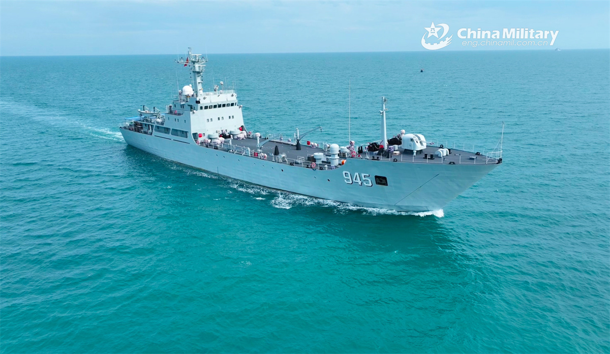 The medium landing ship Huashan (Hull 945) attached to a naval service ship group under the Chinese PLA Southern Theater Command maneuvers at sea during a maritime combat training exercise in the South China Sea in early March 2025. (eng.chinamil.com.cn/Photo by Wu Huanqing)