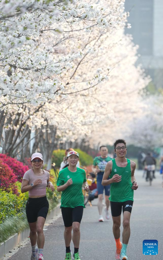 People run past blooming cherry blossoms in Hangzhou, east China's Zhejiang Province, March 26, 2025. More than 3,000 cherry trees are in full bloom currently along Wentao Road in Binjiang District of Hangzhou, becoming a new attraction of the city. (Xinhua/Weng Xinyang)