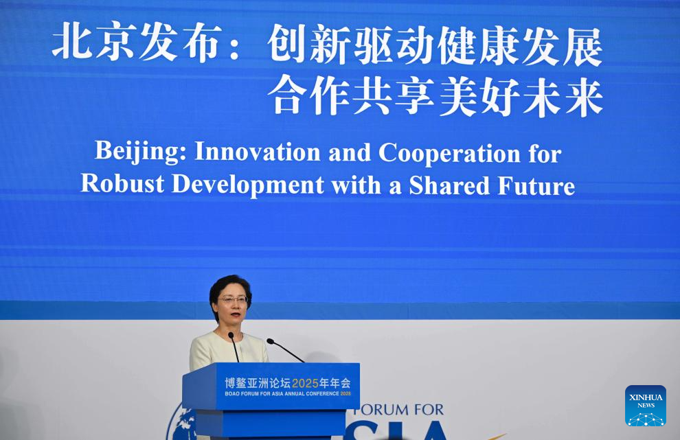 Jin Wei, vice mayor of Beijing, speaks at a Release Moment titled "Beijing: Innovation and Cooperation For Robust Development with a Shared Future" during the Boao Forum for Asia (BFA) Annual Conference 2025 in Boao, south China's Hainan Province, March 26, 2025. (Xinhua/Guo Cheng)