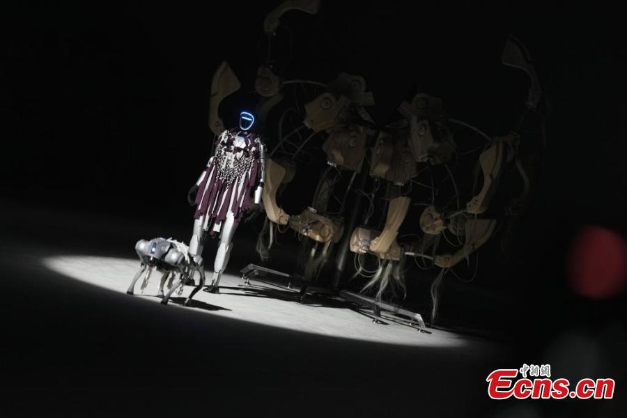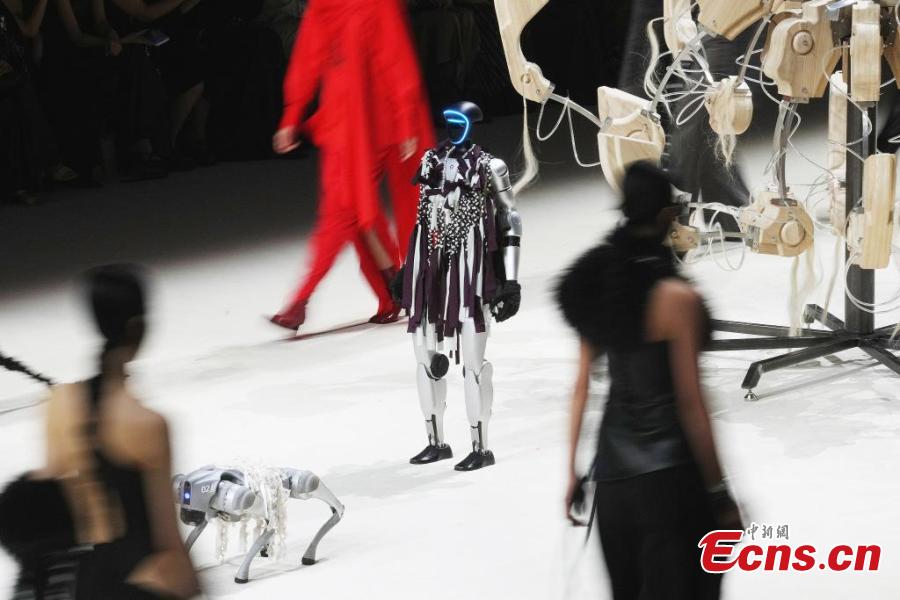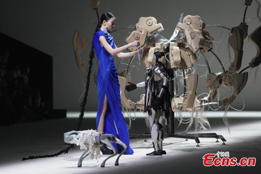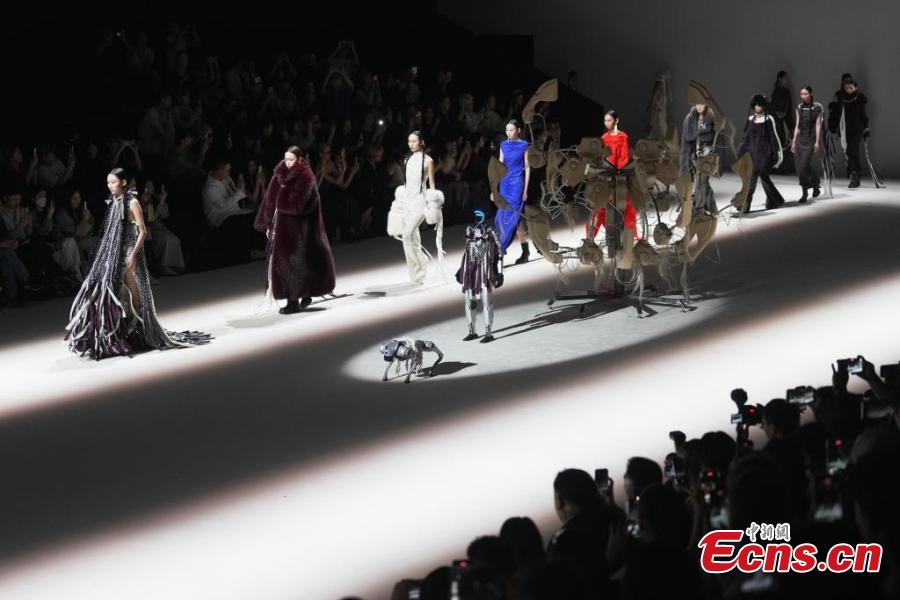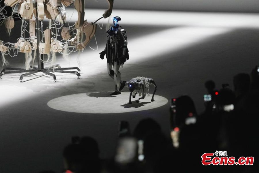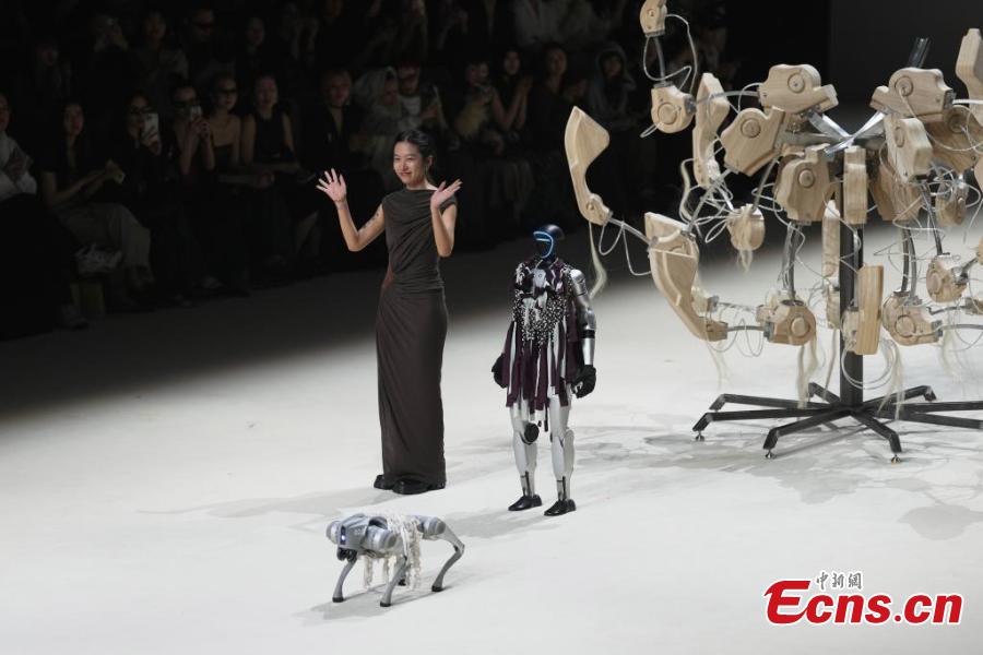 The humanoid robot G1, accompanied by a robotic dog, makes its debut at Shanghai Fashion Week, March 26, 2025. (China News Service/Zhang Hengwei)