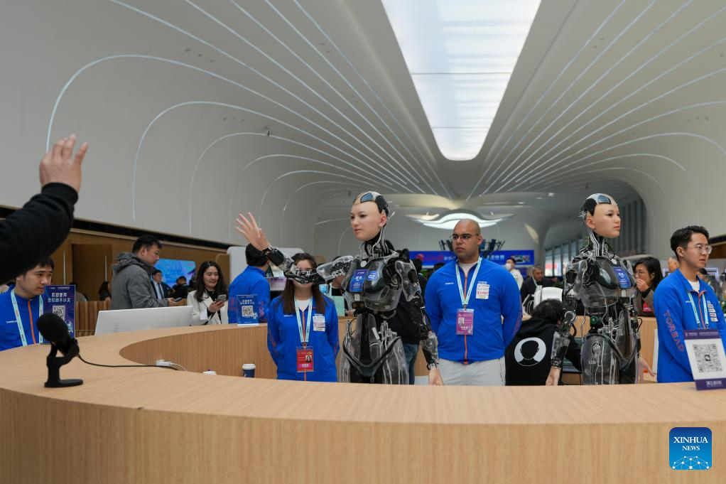 Humanoid robots interact with visitors at Zhongguancun International Innovation Center, venue for the 2025 Zhongguancun Forum (ZGC Forum) Annual Conference, in Beijing, capital of China, March 27, 2025.