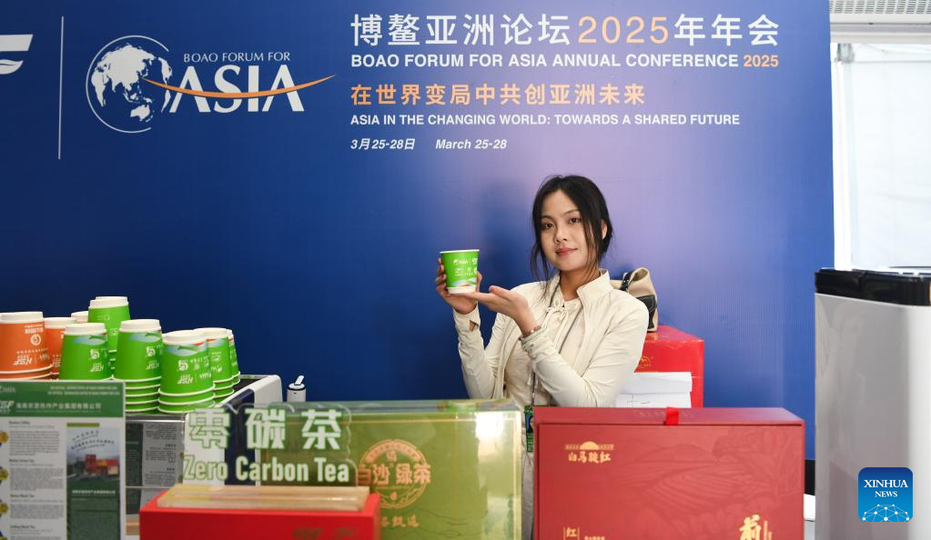 A staff member shows tea products certified for carbon neutrality during the Boao Forum for Asia (BFA) Annual Conference 2025 in Boao, south China's Hainan Province, March 26, 2025. Since its formal inauguration in 2001, the BFA has served as a key platform for the advancement of green development across Asia, facilitating the exchange of insights to promote sustainable growth in the region and beyond.