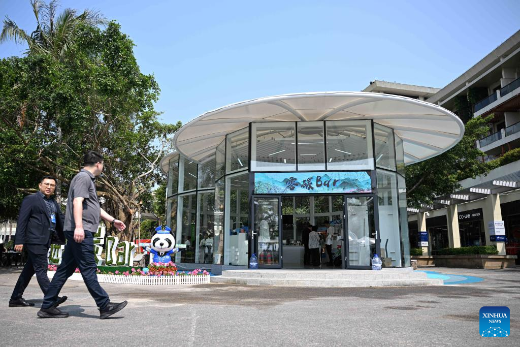 People walk past a zero-carbon bar during the Boao Forum for Asia (BFA) Annual Conference 2025 in Boao, south China's Hainan Province, March 27, 2025. The zero-carbon bar is a space for technology display, practical experience and consumption, as an attempt to transform the concept of zero carbon into accessible practices. Since its formal inauguration in 2001, the BFA has served as a key platform for the advancement of green development across Asia, facilitating the exchange of insights to promote sustainable growth in the region and beyond.