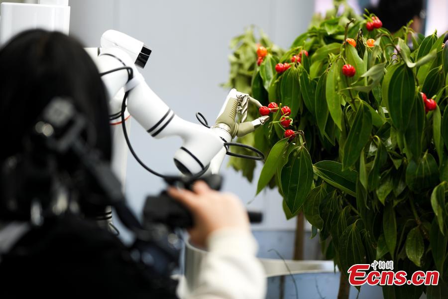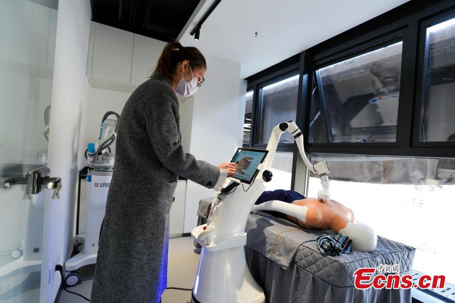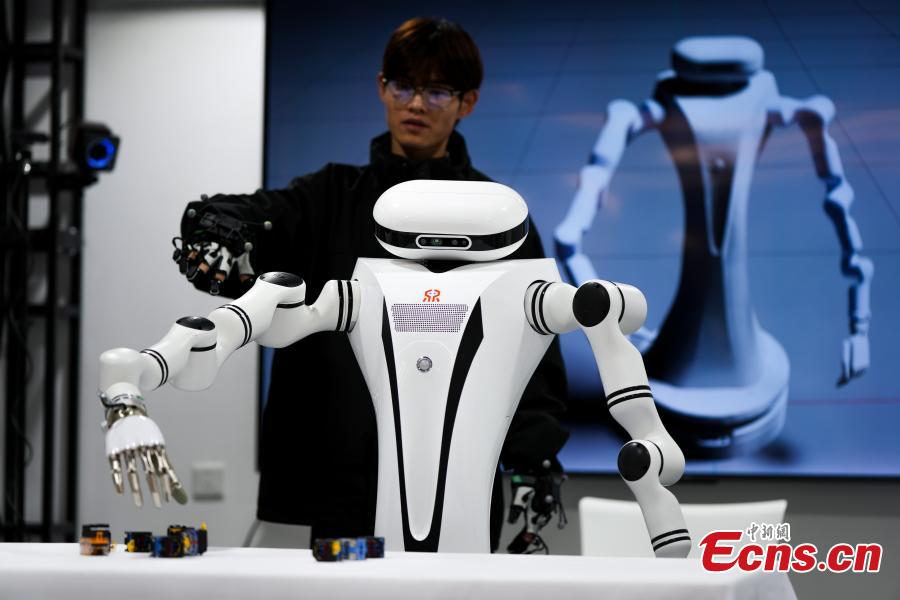 A staff member trains a humanoid robot at the humanoid robot innovation center at Shougang Park in Beijing, March 27, 2025. (China News Service/Zhang Xiangyi)