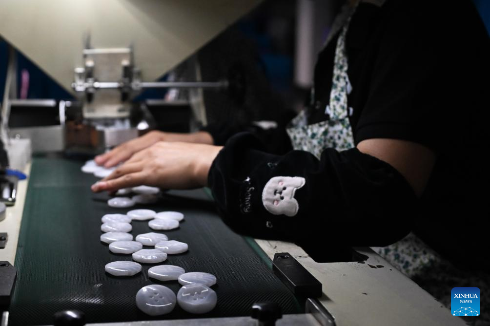 A staff member works at a workshop of a button company in Qiaotou Town of Yongjia County, Wenzhou City, east China's Zhejiang Province, March 26, 2025.