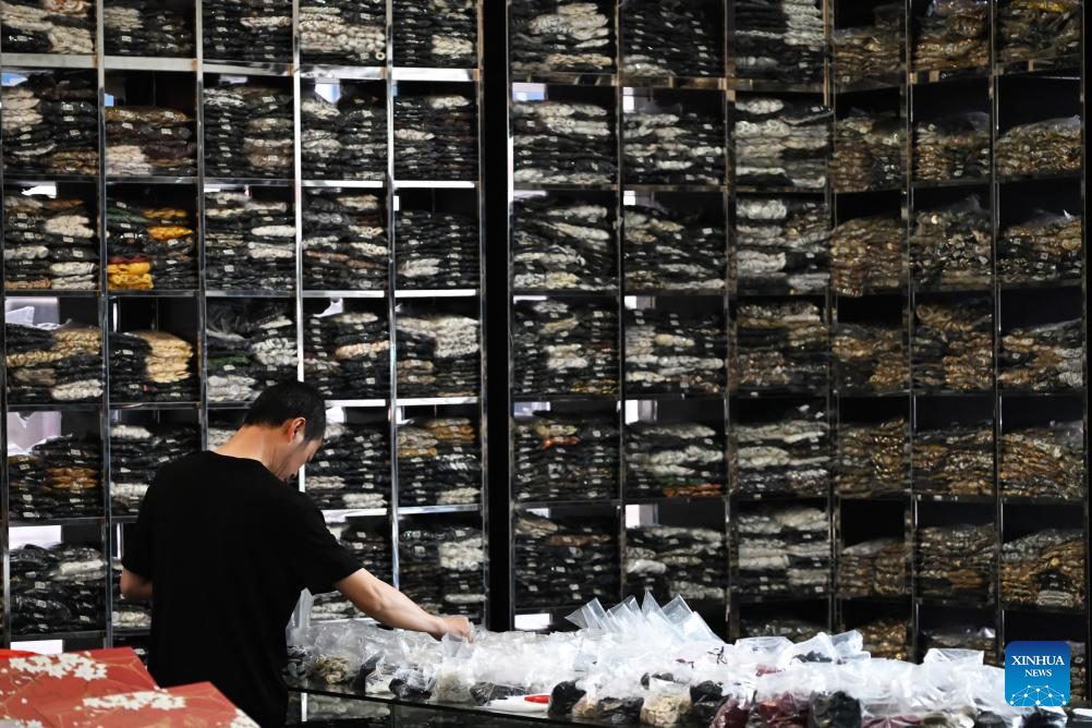 A staff member packs button samples at a button stall in Qiaotou Town of Yongjia County, Wenzhou City, east China's Zhejiang Province, March 26, 2025.