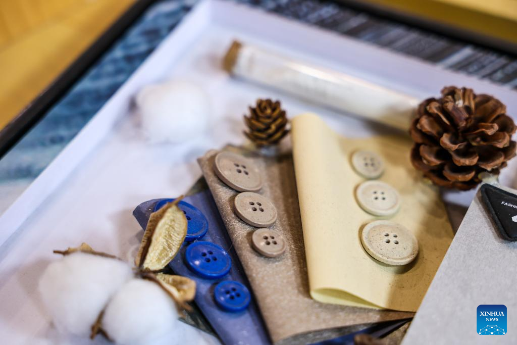 This photo taken on March 27, 2025 shows a type of eco-friendly button made from recycled materials displayed by a button company in Qiaotou Town of Yongjia County, Wenzhou City, east China's Zhejiang Province.