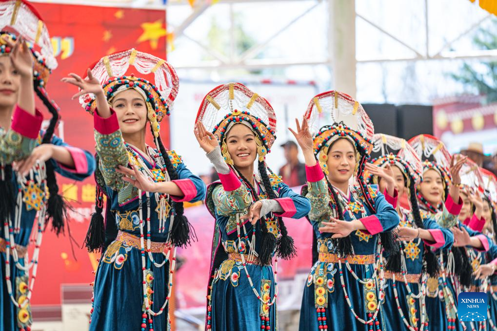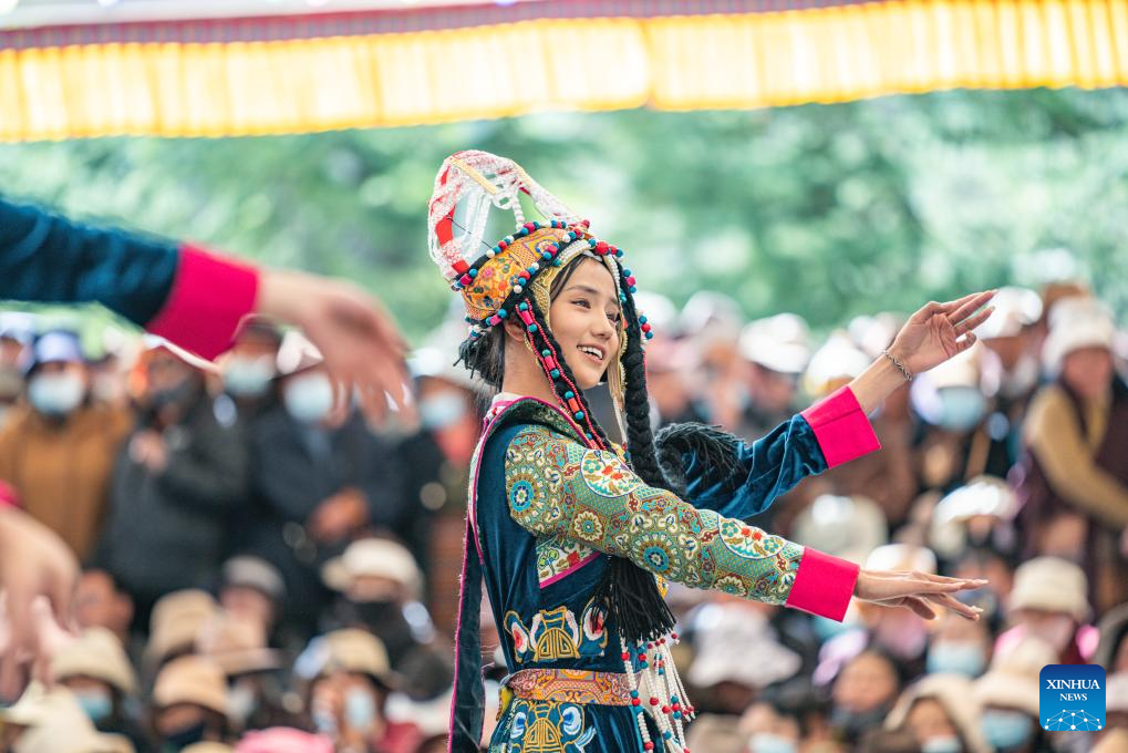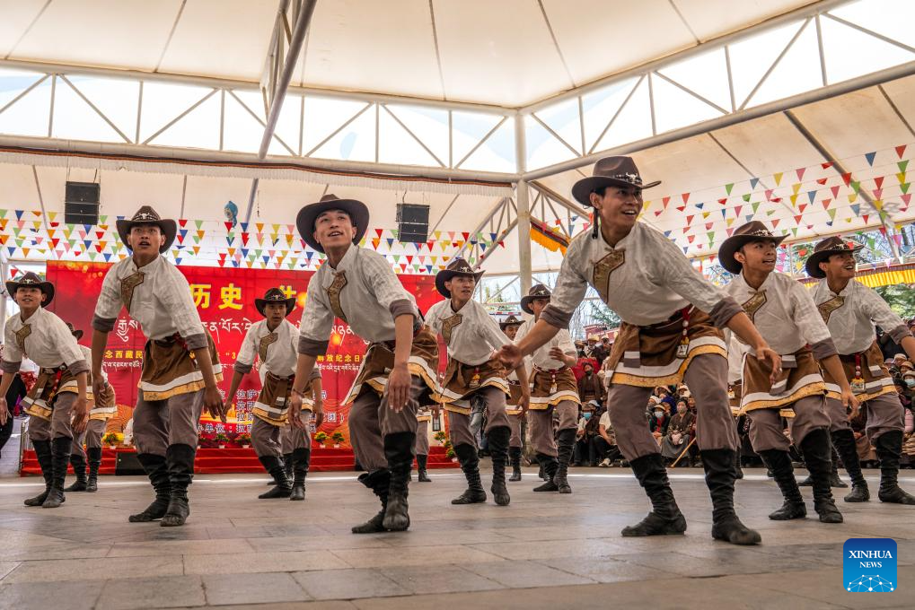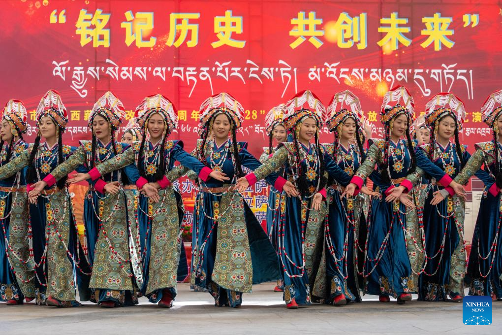 People watch a performance at a park to celebrate the Serfs' Emancipation Day in Lhasa, capital of southwest China's Xizang Autonomous Region, March 28, 2025. Friday marks the 66th anniversary of the democratic reform that ended feudal serfdom in southwest China's Xizang Autonomous Region, with multiple grand celebrations and commemorative activities held across the region.