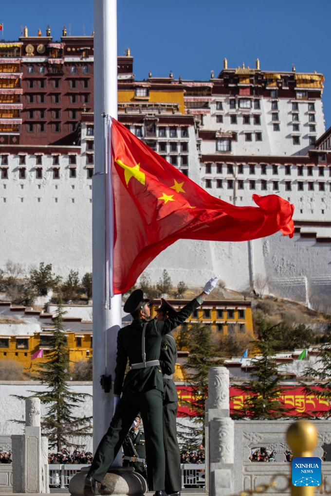 A flag-raising ceremony is held to celebrate the Serfs' Emancipation Day at the square in front of the Potala Palace in Lhasa, capital of southwest China's Xizang Autonomous Region, March 28, 2025. Friday marks the 66th anniversary of the democratic reform that ended feudal serfdom in southwest China's Xizang Autonomous Region, with multiple grand celebrations and commemorative activities held across the region.