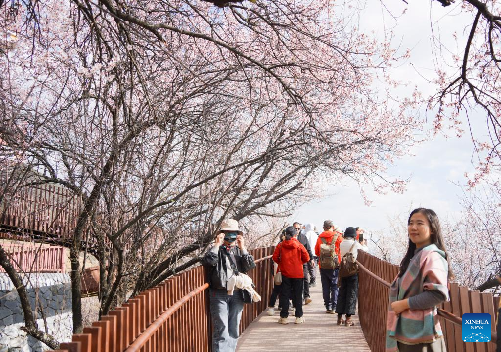 Tourists appreciate peach blossoms in Nyingchi, southwest China's Xizang Autonomous Region, March 29, 2025. As the weather warms up, peach blossoms in Nyingchi are in full bloom, attracting numerous tourists. (Xinhua/Qi Zhiyue)