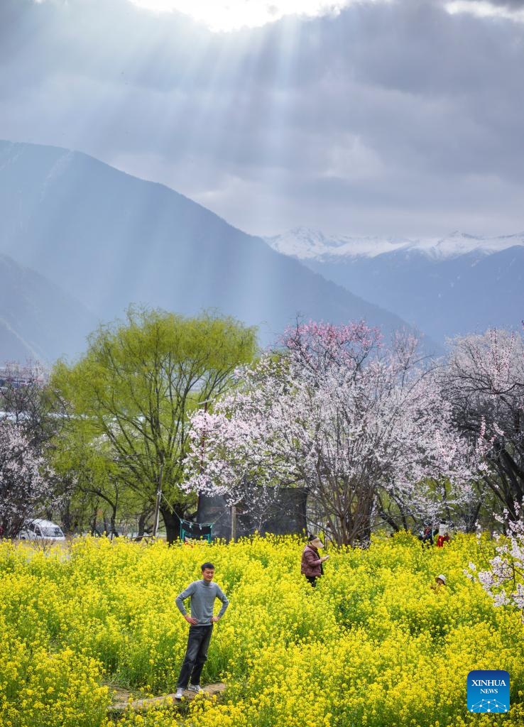 Tourists appreciate the flowers in Nyingchi, southwest China's Xizang Autonomous Region, March 29, 2025. As the weather warms up, peach blossoms in Nyingchi are in full bloom, attracting numerous tourists. (Xinhua/Qi Zhiyue)