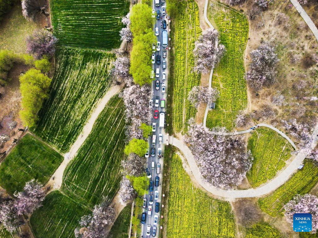An aerial drone photo shows a view of blooming flowers in Nyingchi, southwest China's Xizang Autonomous Region, March 29, 2025. As the weather warms up, peach blossoms in Nyingchi are in full bloom, attracting numerous tourists. (Xinhua/Qi Zhiyue)
