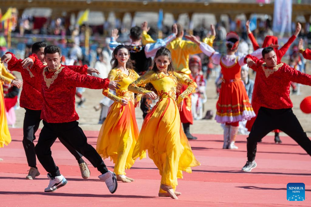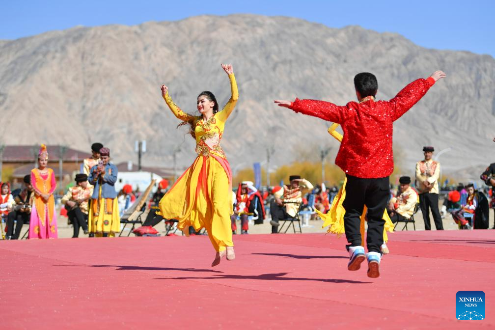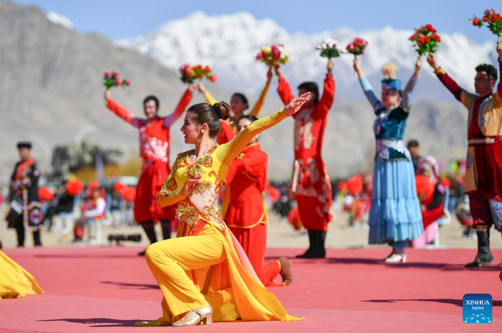Amangul Wapik (C) and her colleagues stage a performance during a spring tourism activity in Tiznap Town of Taxkorgan Tajik Autonomous County, northwest China's Xinjiang Uygur Autonomous Region, March 23, 2025. (Xinhua/Hu Huhu)