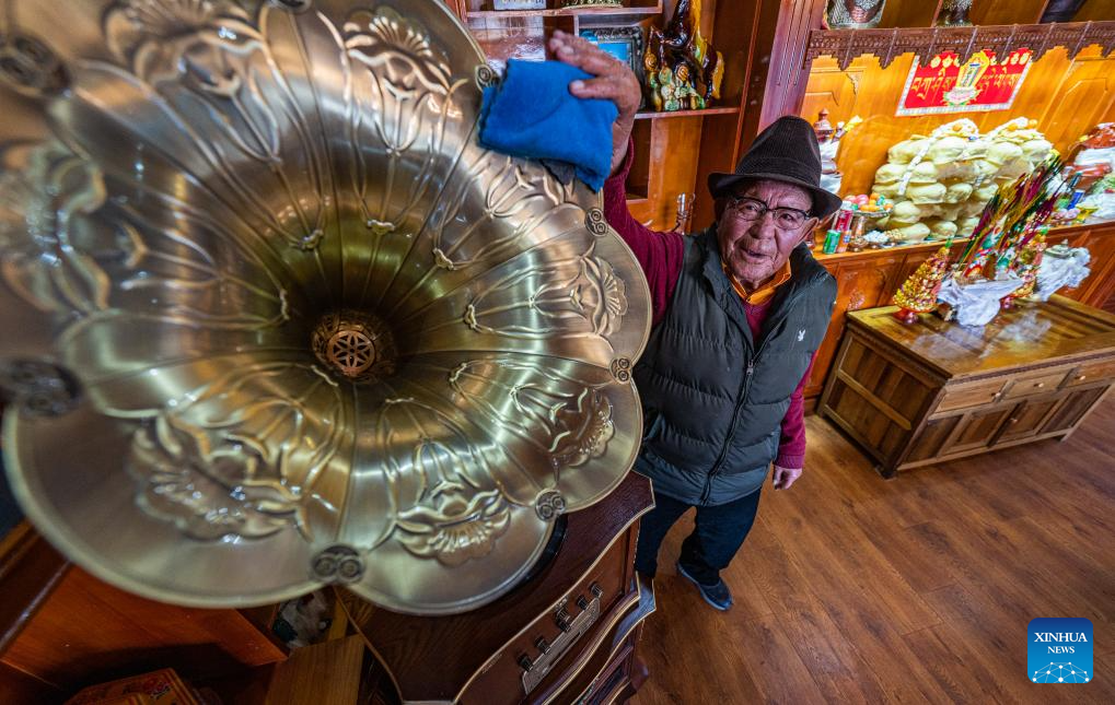 Losang wipes a record player at home in Doilungdeqen District of Lhasa, southwest China's Xizang Autonomous Region, March 20, 2025. (Xinhua/Tenzin Nyida)